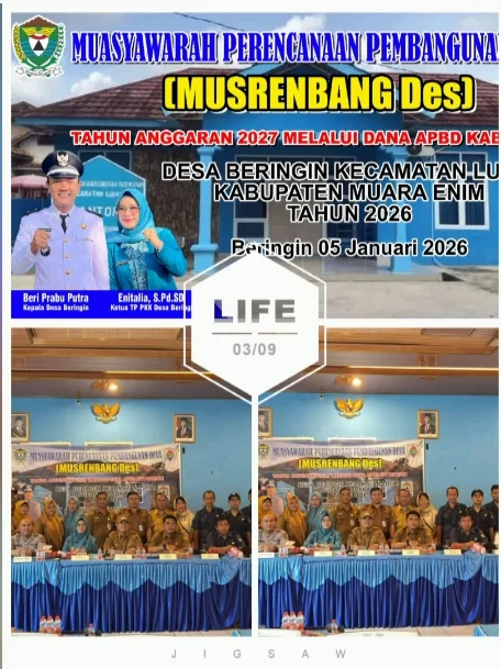 Muara Enim, Zonamerahnews.id – Musyawarah Perencanaan Pembangunan Desa (Musrenbangdes) Desa Beringin untuk Tahun Anggaran 2027 sukses diselenggarakan pada hari Senin, (05/01/2026), di Aula Kantor Desa Beringin Kecamatan Lubai.
