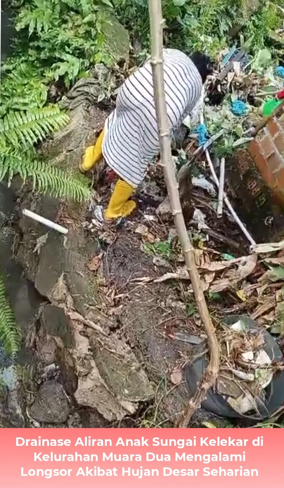 Drainase anak sungai Kelekar yang melintas sekitar Kantor Lurah Kelurahan Muara Dua (induk), tepatnya di RT 002 RW 002 Kelurahan Muara Dua, Kecamatan Prabumulih Timur, Kota Prabumulih mengalami longsor pada Minggu (08/02/2026). Kejadian tersebut membuat salah satu rumah warga terancam ambruk. (08/02/2026).