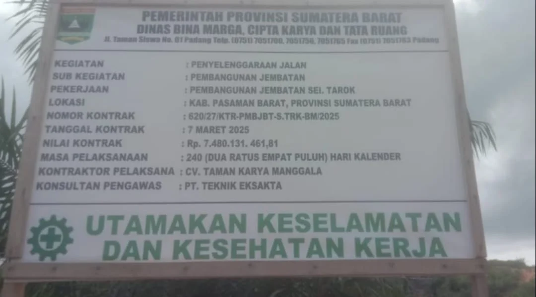 Seperti diketahui proyek jembatan Sei Tarok Jorong Ranah Penantian Poros ini merupakan proyek Dinas Bina Marga, Cipta Karya dan Tata Ruang (BMCKTR) Provinsi Sumbar yang dilaksanakan oleh CV Taman Karya Manggala.